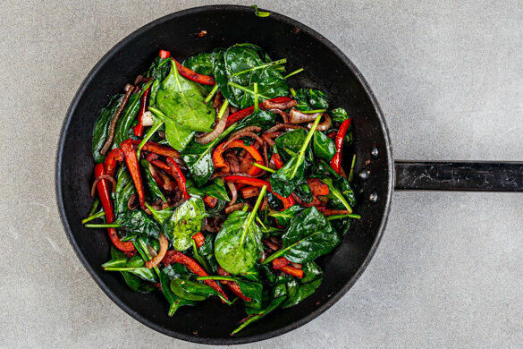 Sobald die Zwiebeln und die Paprika gar sind, das Gulaschgewürz unterrühren und die Pfanne vom Herd nehmen. Den Spinat vorsichtig unterheben. Es macht nichts, wenn nicht alle Spinatblätter zusammenfallen. Die Pommes auf Teller verteilen, die Sauce und das Gemüse darüber verteilen und die Poutine mit dem Lauchzwiebelgrün servieren.