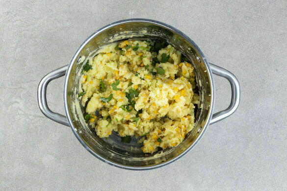Die Kartoffeln zurück in den Topf geben und zu einem cremigen Püree stampfen, dabei nach Bedarf etwas Kochwasser hinzugeben. Tipp: Wer mag, kann noch 1EL Butter hinzufügen. Den Mais abgießen, untermengen und das Püree mit Salz und Pfeffer abschmecken.