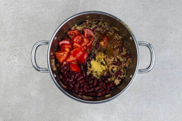 Die Zwiebelstreifen, das Hackfleisch und 1TL Gewürzmischung in einem großen Topf mit 1EL Olivenöl bei mittlerer Hitze 3–4Min. anbraten. Die Tomaten, die Bohnen und die ½ des Brühgewürzes zugeben, 100ml Wasser angießen und das Chili abgedeckt ca. 10Min. köcheln lassen.