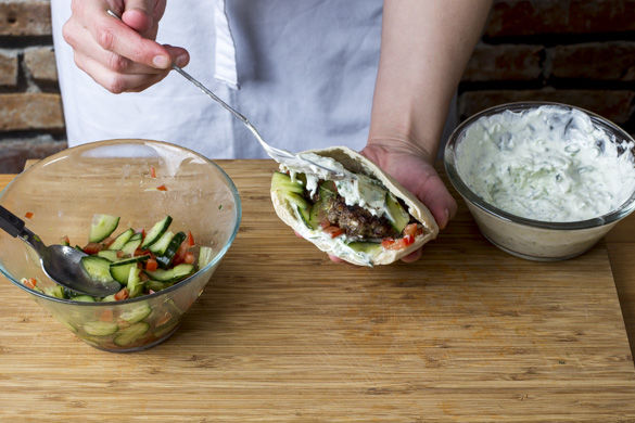 Diesen Burger kannst du dir so füllen, wie du es am liebsten magst! Mit dem Salat im Brot oder als Beilage daneben spielt keine Rolle, denn lecker wird es so oder so. Zusammen transportieren dich die saftigen Patties aus Rindfleisch, das knusprige Pitabrot und das frische Tzatziki gefühlt direkt in den Sommer.