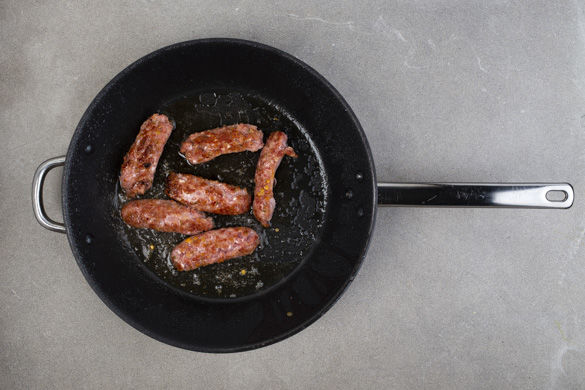 Die Salsiccia-Scheiben in einer großen Pfanne mit 1EL Olivenöl bei mittlerer bis starker Hitze ca. 2–3Min. von beiden Seiten knusprig anbraten. Aus der Pfanne nehmen und beiseitestellen.