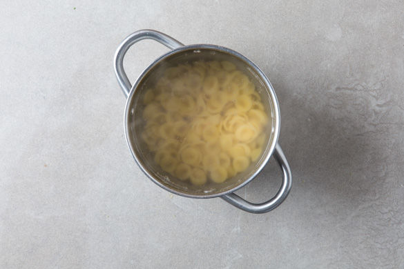 Sobald das Wasser kocht, die Orecchiette hineingeben und in ca. 10–12Min. bissfest kochen. Ca. 400ml Pastawasser abschöpfen, die Nudeln in ein Sieb abgießen und mit kaltem Wasser abschrecken.