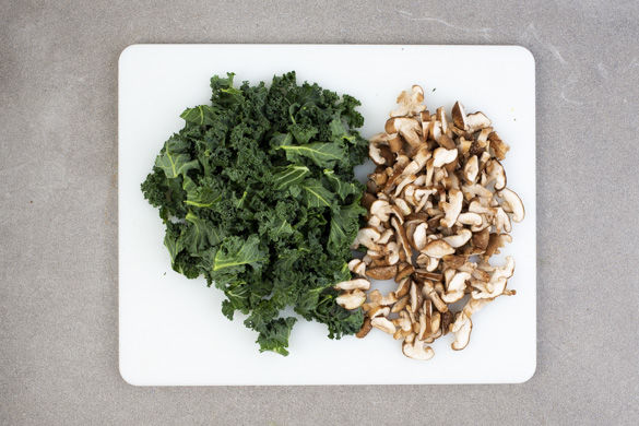 Die harten Grünkohlstängel entfernen und die Grünkohlblätter in kleine, mundgerechte Stücke zupfen. Die Stiele der Shiitakepilze entfernen und die Pilze in dünne Scheiben schneiden.