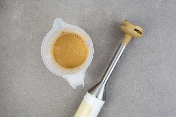 Den Knoblauch, die 1/2 des Zitronenabriebs, 2EL Zitronensaft, die Misopaste, die Cashewkerne und 250ml Wasser in einem hohen Gefäß mischen und mithilfe eines Stabmixers zu einer cremigen Sauce pürieren, dabei falls nötig etwas mehr Wasser zufügen.