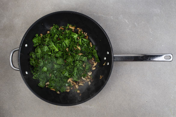 Inzwischen die Pilze in einer großen Pfanne mit 1–2EL Pflanzenöl bei starker Hitze ca. 2–3Min. anbraten. Den Grünkohl hinzugeben und ca. 3–4Min. mitbraten, bis er zusammengefallen ist. Mit Salz und Pfeffer abschmecken.