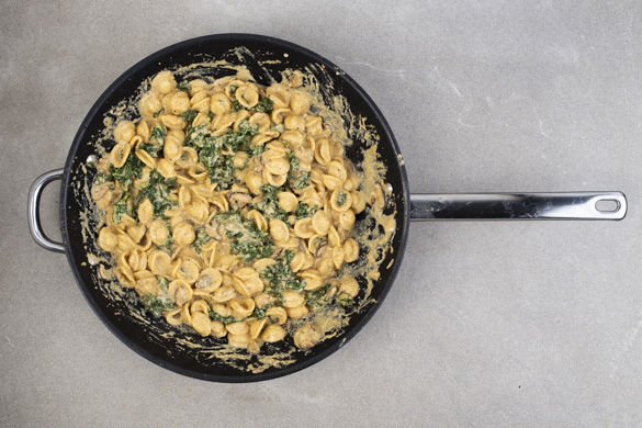 Die Miso-Cashew-Sauce und die Pasta zum Grünkohl in die Pfanne geben und alles gut vermengen, dabei ggf. Pastawasser untermischen, bis die gewünschte Sämigkeit erreicht ist. Die Grünkohl-Pilz-Orecchiette mit dem restlichen Zitronenabrieb garniert servieren.