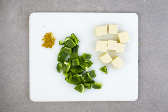 Den Käse in 8 gleich große Würfel schneiden. Die Paprika vierteln, entkernen und ca. 1–2cm große Stücke schneiden. Den Käse und die Paprika auf einem mit Backpapier ausgelegten Backblech mit 1EL Olivenöl und dem Currypulver mischen und im Ofen ca. 10Min. backen, bis der Käse knusprig ist.