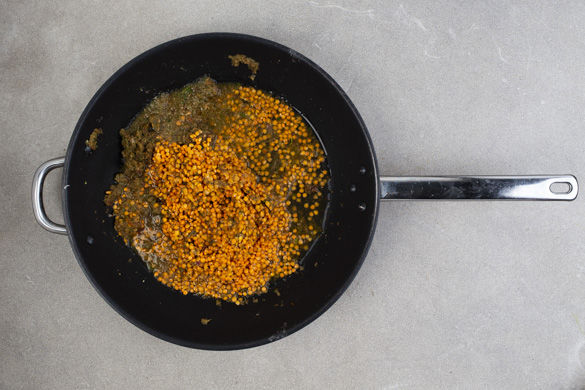 Den Ofen auf 240°C Ober-/Unterhitze vorheizen. Die Linsen in einem Sieb unter kaltem Wasser abspülen, mit 1,5L Wasser in einen mittelgroßen Topf geben und einmal aufkochen lassen. Die Hitze reduzieren und die Linsen abgedeckt in ca. 10–15Min. gar köcheln lassen. Die Linsen in ein Sieb abgießen, dabei ca. 250ml Kochwasser auffangen.