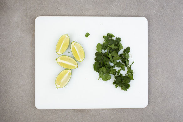 Die Korianderblätter von den Stängeln zupfen und grob hacken. Die Limette in Spalten schneiden. Den ausgetretenen Bratensaft der Steaks unter das Bohnengemüse mischen, ggf. erneut mit Salz und Pfeffer abschmecken. Die Steaks mit dem Reis und dem Bohnengemüse anrichten. Mit Koriander garnieren und die Limettenspalten dazu servieren.