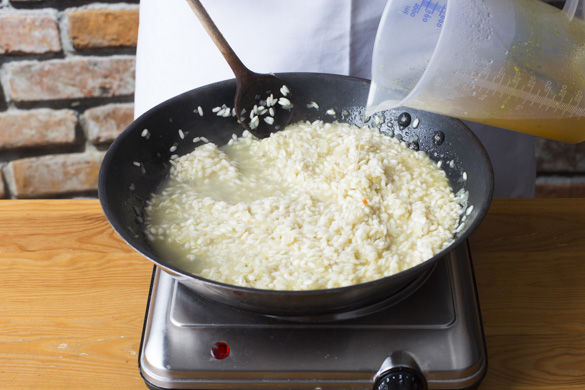 Die Zwiebeln in einer großen Pfanne mit 1–2EL Olivenöl bei mittlerer Hitze ca. 1–2Min. farblos anschwitzen, dann den Reis hinzugeben und ca. 1–2Min. mitbraten. Nach und nach mit der heißen Brühe ablöschen und rühren, bis der Reis sämig ist, aber noch etwas Biss hat – das dauert ca. 18–20Min.
