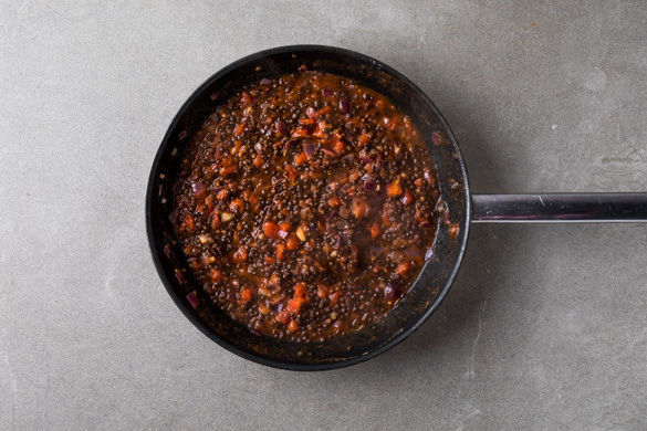 Die Zwiebeln und den Knoblauch in einer mittelgroßen Pfanne mit 1EL Olivenöl bei mittlerer Hitze glasig anschwitzen. Die gehackten Tomaten und die Gewürzmischung unterrühren und die Sauce 8–10Min. sanft köcheln lassen. Die Linsen untermischen und die Sauce mit Salz und Pfeffer abschmecken.