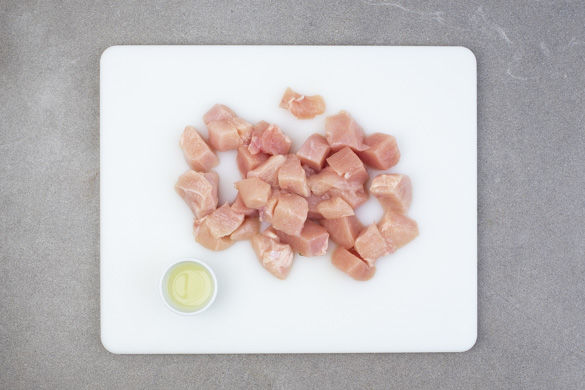In einem mittelgroßen Topf 400ml leicht gesalzenes Wasser zum Kochen bringen. Die Hähnchenbrüste mit etwas Küchenkrepp trocken tupfen und in ca. 1–2cm große Würfel schneiden. Die Limette auspressen.