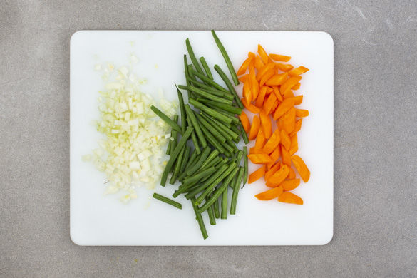 Die Karotten schälen, längs halbieren und in schräge, ca. 1cm dünne Scheiben schneiden. Die Enden der Bohnen abschneiden und die Bohnen quer halbieren. Die Zwiebel schälen, halbieren und in feine Würfel schneiden.