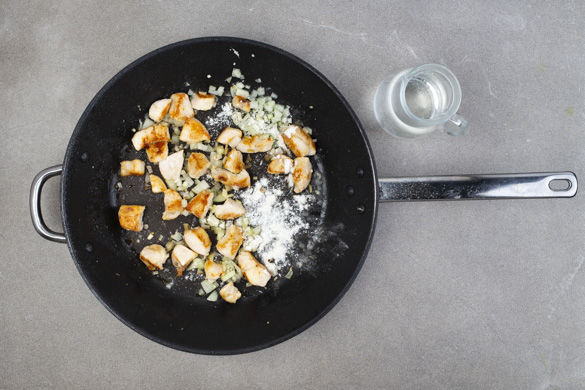 Das Fleisch in einer mittelgroßen Pfanne mit 1–2EL Pflanzenöl bei mittlerer Hitze ca. 2–3Min. leicht anbraten, die Zwiebeln hinzufügen und ca. 1–2Min. farblos anschwitzen. Mit 1EL Mehl bestäuben und mit 300ml Wasser ablöschen. Den Brühwürfel hineinbröseln und alles ca. 6–8Min. köcheln lassen.