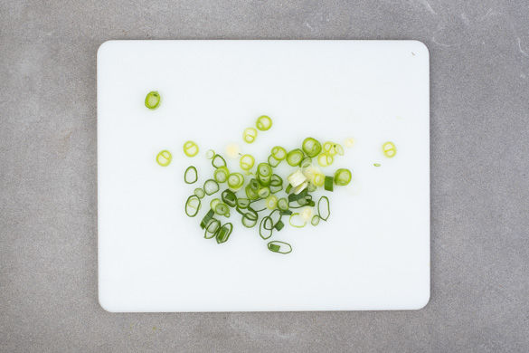 Die Lauchzwiebel in dünne Ringe schneiden. Das Hähnchenragout auf dem Reis anrichten und mit den Lauchzwiebeln garniert servieren.
