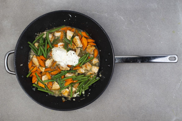 Die Karotten und die Bohnen hinzufügen und ca. 6–8Min. mitkochen. Die Crème fraîche und Limettensaft nach Geschmack dazugeben, mit Salz und Pfeffer abschmecken.