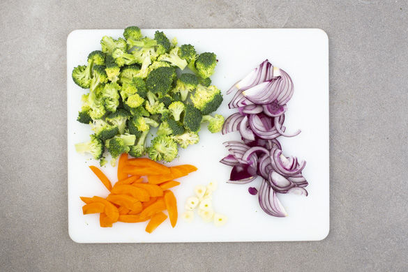 Den Brokkoli in mundgerechte Röschen schneiden, den Strunk abschneiden. Die Karotte und den Brokkolistrunk schälen, längs halbieren und schräg in dünne Scheiben schneiden.Die Zwiebel schälen, halbieren und feine Halbringe schneiden. Den Knoblauch schälen und in dünne Scheibchen schneiden.