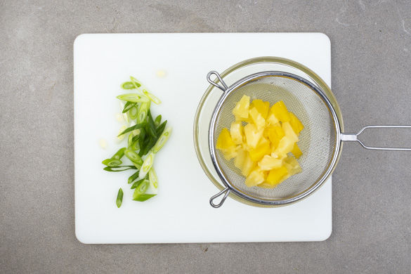 Die Lauchzwiebeln schräg in dünne Ringe schneiden. Die Ananas in ein Sieb abgießen und abtropfen lassen, dabei den Saft auffangen. 1/2 der Ananas in ca. 1cm große Stücke schneiden. Tipp: Die restliche Ananas später einfach als Dessert genießen!