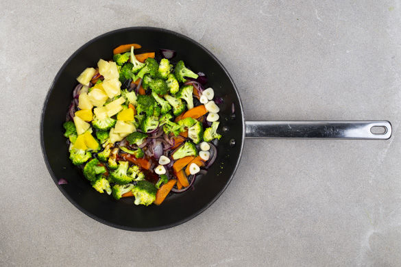 Brokkoli, Karotten und Zwiebeln in einer großen Pfanne mit 1–2EL Öl bei starker Hitze ca. 2–3Min. scharf anbraten. Die Sweet–Chili–Sauce einrühren, die 1/2 der Ananasstücke, 1/3 des Saftes und den Knoblauch dazugeben und ca. 5–6Min. einköcheln lassen. Tipp: 2–3TL Stärke und 2–3EL kaltes Wasser verrühren und zur Sauce geben, so dickt sie schneller ein.
