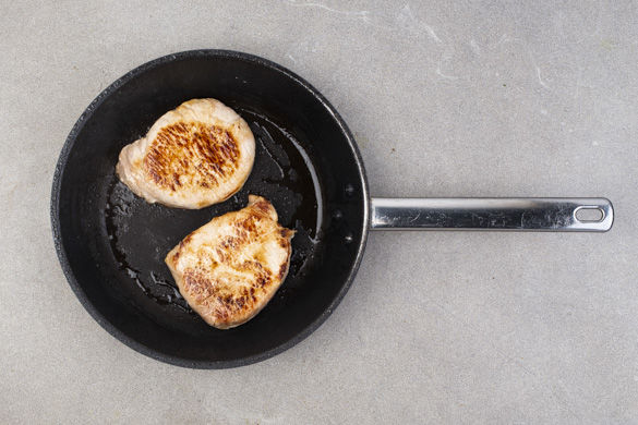 Die Steaks in einer weiteren großen Pfanne mit 1EL Öl bei starker Hitze auf jeder Seite ca. 1Min. scharf anbraten, bis das Fleisch von außen eine schöne Farbe angenommen hat und durchgegart ist. Die Pfanne vom Herd nehmen und das Fleisch mit Salz und Pfeffer würzen.