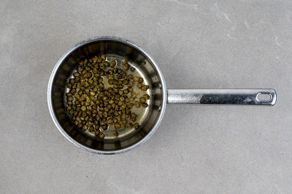Einen kleinen Topf ca. 1cm hoch mit Pflanzenöl füllen. Das Öl stark erhitzen. Tipp: Das Öl ist heiß genug, sobald sich kleine Bläschen bilden, wenn man einen Holzspieß hineinhält. Die Kapern in das heiße Öl geben und ca. 1–3Min frittieren, bis sie sich öffnen. Mit einer Schaumkelle herausnehmen und auf Küchenkrepp abtropfen lassen.