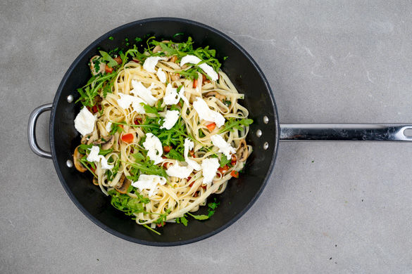 Du hast Lust auf ein unkompliziertes Pastagericht, das trotzdem den nötigen Pfiff hat? Dann probiere diese Tagliatelle, die mit einer leckeren Kombination aus gebratenen Pilzen, Peperoni und Tomaten, aromatisch-bitterem Rucola, mildem Mozzarella und knusprigen Oregano-Panko-Bröseln zu Höchstform auflaufen.