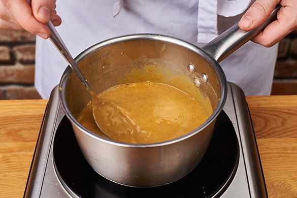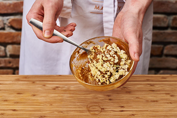 Den Backofen mit Grillfunktion auf höchster Stufe vorheizen. Den Knoblauch schälen und fein hacken. Die Erdnussbutter mit der Sweet-Chili-Sauce, der Sojasauce und der Gewürzmischung glatt rühren, dann den Knoblauch und 2–3EL Wasser unterrühren.