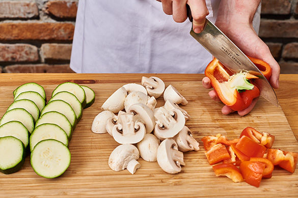 Die Zucchini in ca. 1cm dünne Scheiben schneiden. Die Champignons ggf. mit etwas Küchenkrepp oder einer Bürste säubern und halbieren. Die Paprika halbieren, entkernen und in ca. 2cm große Stücke schneiden.