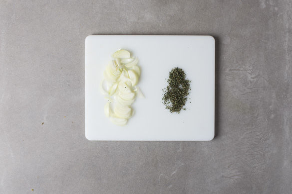 In einem großen Topf ausreichend leicht gesalzenes Wasser für die Pasta zum Kochen bringen. Die Zwiebeln schälen, halbieren und in feine Halbringe schneiden. Die Thymianblättchen von den Stängeln streifen und fein hacken.