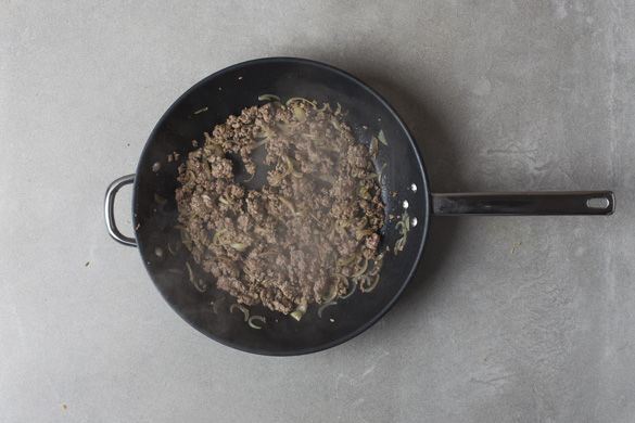 Die Zwiebeln in einer großen Pfanne mit 1–2EL Olivenöl bei niedriger Hitze ca. 2–3Min. glasig dünsten. Das Hackfleisch dazugeben und bei starker Hitze ca. 5–6Min. scharf anbraten.