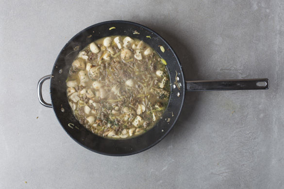 Die Pilze und den Lauch zum Fleisch in die Pfanne geben und ca. 2–3Min. mitbraten. Mit 2–3EL Mehl bestäuben, kurz umrühren und mit ca. 400ml Wasser ablöschen. Den Brühwürfel in der Sauce auflösen, den Thymian unterrühren und mit Pfeffer und ca. 1EL Essig würzen. Ca. 6–8Min. köcheln lassen, dabei nach Bedarf bis zu ca. 100ml Wasser hinzufügen.