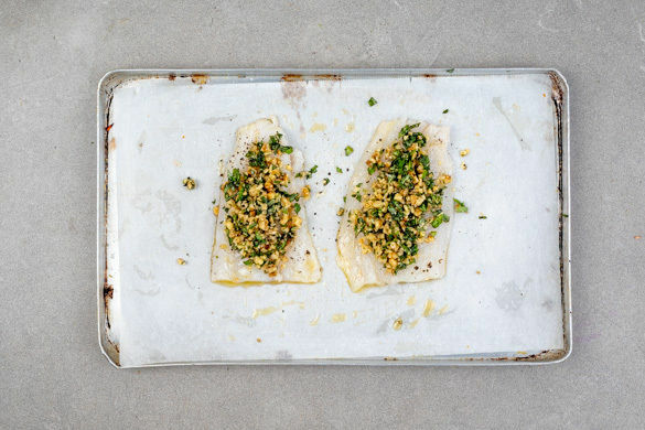 Den Fisch von evtl. vorhandenen Gräten befreien und auf ein mit Backpapier ausgelegtes Backblech geben. Die Nussmischung auf dem Fisch verteilen und den Fisch 4–6Min. im Ofen backen, bis der Fisch gar ist.