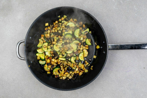 Den Backofen auf 220°C Umluft (240°C Ober-/Unterhitze) vorheizen. Die Aubergine in ca. 1cm kleine Würfel schneiden. Die Zucchini längs halbieren und in dünne Scheiben schneiden. Das Gemüse in einer großen Pfanne mit 2EL Olivenöl und 1 Prise Salz bei starker Hitze 3–4Min. goldbraun anbraten.