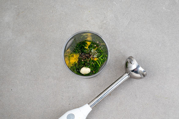 Den Dill, den Zitronenabrieb und den Knoblauch mit 2EL Olivenöl und 1–2EL Wasser in einem hohen Gefäß mit einem Stabmixer fein pürieren. Das Pesto mit Salz und Pfeffer abschmecken.