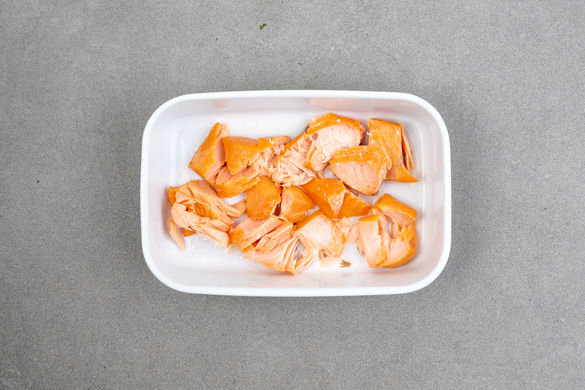 Den Fisch mit einer Gabel oder mit den Händen in mundgerechte Stücke zupfen, dabei die Haut entfernen. Vorsicht, der Fisch kann Gräten enthalten. Diese ggf. mit einer Pinzette entfernen oder später beim Essen darauf achten. Den Lachs in eine Auflaufform geben und etwas Pastawasser darüberträufeln. Den Fisch in den Ofen geben und bis zum Servieren aufwärmen.