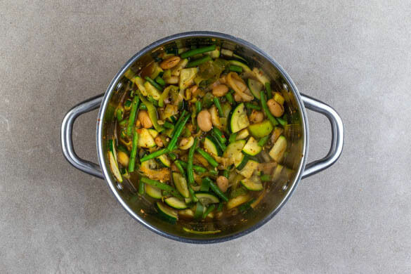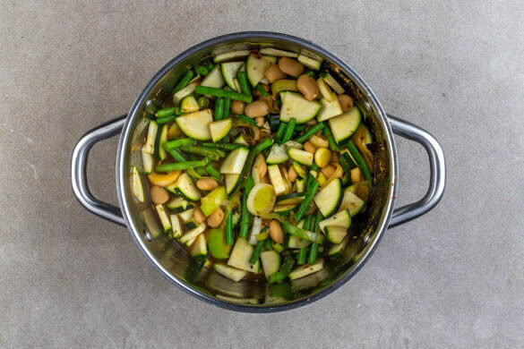 Den Knoblauch und den Lauch in einem großen Topf mit 4EL Olivenöl und der italienischen Gewürzmischung bei mittlerer Hitze 2–4Min. anbraten. 600–800ml Wasser angießen, das Brühgewürz einrühren und die weißen und die grünen Bohnen zugeben. Zum Kochen bringen und abgedeckt ca. 5Min. köcheln lassen. Die Zucchini zugeben und den Eintopf ca. 5Min. weiterköcheln.