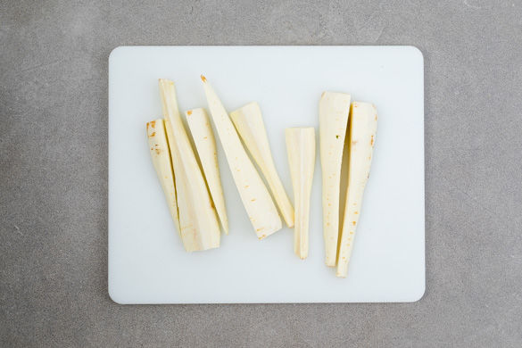 Den Backofen auf 220°C Umluft (240°C Ober-/Unterhitze) vorheizen. Die Pastinaken schälen, halbieren und längs vierteln.