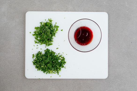 Die Zitrone auspressen. Die Granatapfelmelasse mit 1EL Olivenöl und 1 Prise Salz gut verrühren. Das Dressing mit etwas Zitronensaft abschmecken. Die Minzeblätter von den Stängeln zupfen und fein hacken. Die Petersilie samt Stängeln fein hacken.