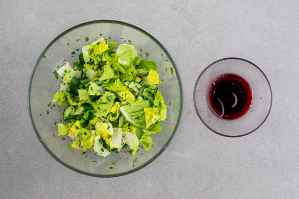 Den Romanasalat längs vierteln, den Strunk entfernen, dann den Salat in ca. 1cm breite Stücke schneiden. Die Gurke längs halbieren und in dünne Scheiben schneiden. Den Romanasalat und die Gurkenscheiben mit dem Granatapfeldressing und den Kräutern vermengen.