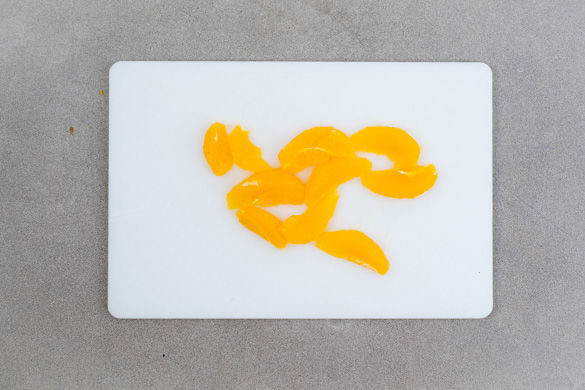 Die Orange filetieren: Dafür die Orangenschale so herunterschneiden, dass die weiße Haut vollständig vom Fruchtfleisch entfernt wird. Dann die Filets vorsichtig aus den weißen Zwischenräumen schneiden, dabei den austretenden Saft auffangen. Den ggf. in der Orange verbliebenen Saft auspressen und zum aufgefangenen Saft geben.