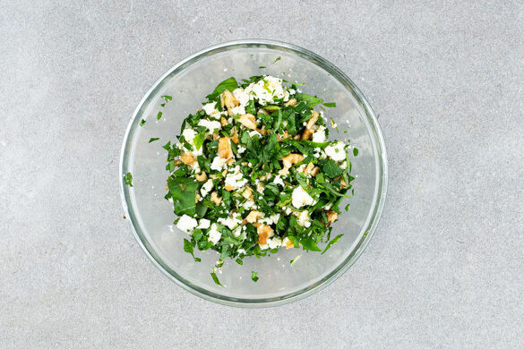 Die Petersilienblätter abzupfen und grob hacken, die Petersilienstängel fein schneiden. Den Feta mit den Fingern oder einer Gabel zerkrümeln, dann mit den Kräutern und den Walnüssen vermengen. Die Suppe auf tiefe Teller oder Schalen verteilen, jeweils 3–4 Hackbällchen darauf anrichten und mit der Gremolata garniert servieren.