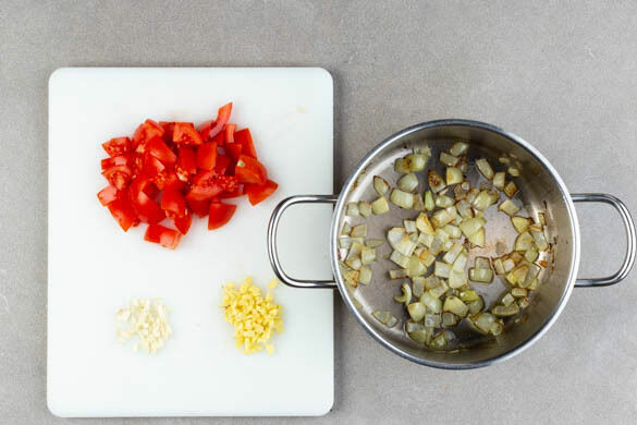 Die Zwiebel schälen, halbieren, grob würfeln und in einem mittelgroßen Topf mit 1EL Pflanzenöl bei mittlerer Hitze ca. 5Min. glasig anschwitzen. Inzwischen den Knoblauch und den Ingwer schälen und grob würfeln, die Tomaten vierteln und in grobe Stücke schneiden.