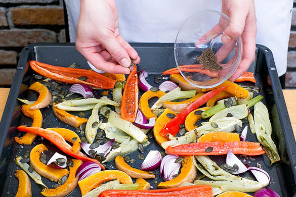 Den Backofen auf die Grillfunktion umstellen. Die Paprika und die Zwiebeln zum Fenchel und Kürbis auf das Blech geben. Mit Kümmel und Kürbiskernen bestreuen und 5–6Min. goldbraun grillen. Aus dem Ofen nehmen und beiseitestellen.