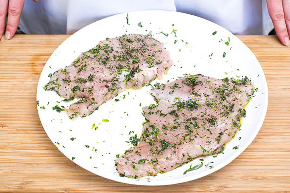 In der Zwischenzeit das Hähnchen mit etwas Küchenkrepp trocken tupfen. Das Fleisch zwischen Klarsichtfolie legen und mit einem Fleischklopfer oder dem Boden eines schweren Topfes ca. 1–2cm dünn klopfen. Mit 1–2EL Olivenöl, Estragon, Salz und Pfeffer einreiben.