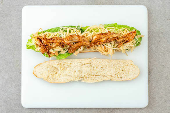 Die Brötchen aufschneiden und nach Geschmack mit den Salatblättern, dem Krautsalat und dem Pulled Chicken belegen. Mit dem restlichen Koriander garnieren und mit dem restlichen Krautsalat servieren.