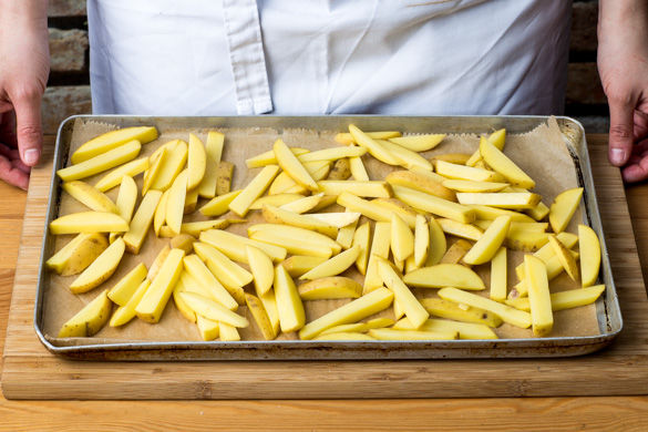 Den Backofen auf 230°C Ober-/Unterhitze (210°C Umluft) vorheizen. Die Kartoffeln in ca. 1cm dünne Stifte schneiden und auf einem mit Backpapier ausgelegten Backblech mit 2EL Pflanzenöl, Salz und Pfeffer vermengen. Die Kartoffeln im Ofen in ca. 25–30Min. goldbraun backen.