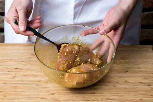 Die Hähnchenbrust mit etwas Küchenkrepp trocken tupfen und längs in je 2 gleich große Stücke schneiden. Das Fleisch mit dem übrigen Tofugewürz, dem Knoblauch und 1–2EL Pflanzenöl marinieren.