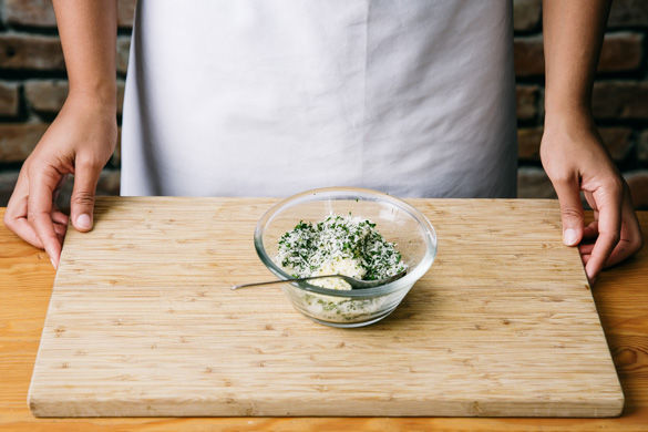 Inzwischen die Rosmarinnadeln von den Stängeln zupfen, die Thymianblätter abstreifen und beides fein hacken. Die Petersilie samt Stängeln ebenfalls fein hacken und alle Kräuter mit ca. 2–3TL Butter und ca. 2/3 des Panko-Paniermehls vermischen. Mit Salz und Pfeffer abschmecken.