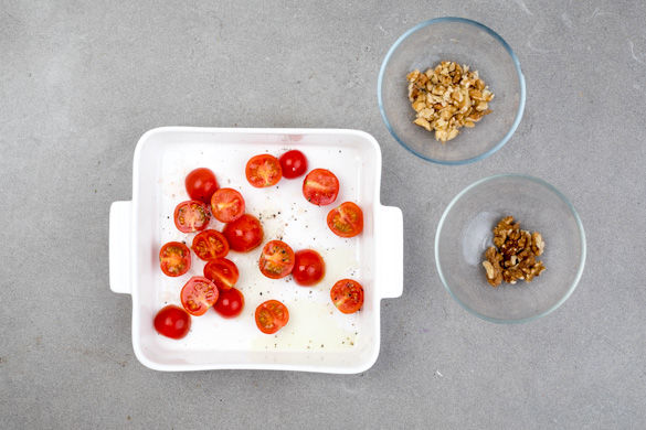 Den Backofen auf 200°C Umluft (220°C Ober-/Unterhitze) vorheizen. In einem mittelgroßen Topf ausreichend leicht gesalzenes Wasser für die Pasta zum Kochen bringen. Die Kirschtomaten halbieren und in einer Auflaufform mit 1–2TL Olivenöl, Salz, Pfeffer und Zucker würzen. Die 1/2 der Nüsse grob hacken, die restlichen Nüsse halbieren.