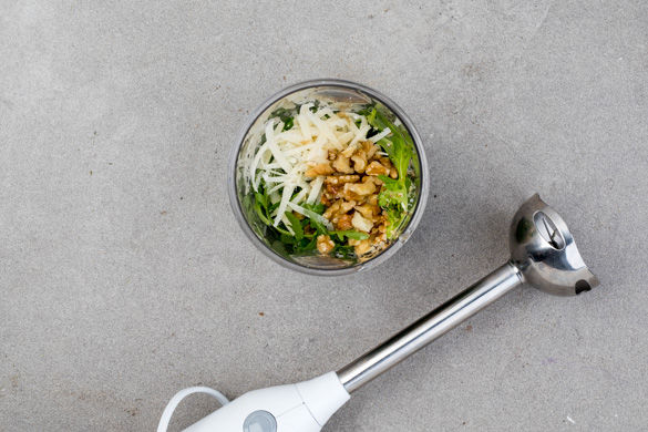 Den Rucola grob schneiden. Den Käse fein reiben. Den Rucola, den Käse und die gehackten Nüsse mit 2–3EL Olivenöl zu einem Pesto pürieren, dabei nach Bedarf etwas Wasser hinzugeben. Mit Salz und Pfeffer abschmecken.